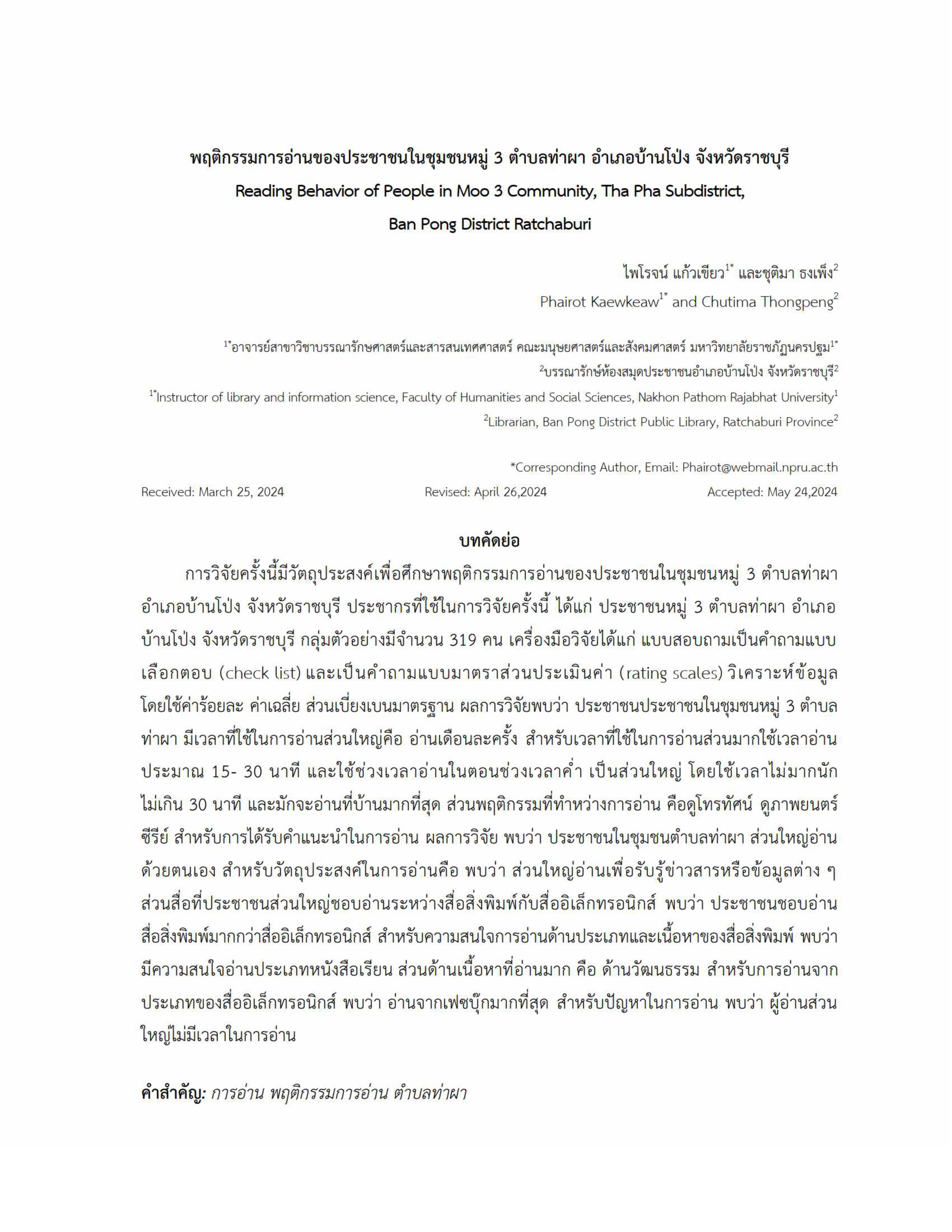 Reading Behavior of People in Moo 3 Community, Tha Pha Subdistrict, Ban Pong District Ratchaburi